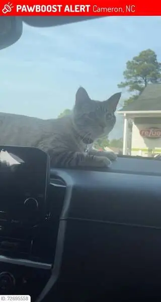 Male young cat, sweet, friendly, must be an indoor cat. He had been laying under our truck all day. Big dark stripe down his back, spots on his side, green eyes.