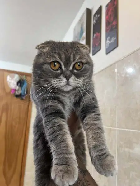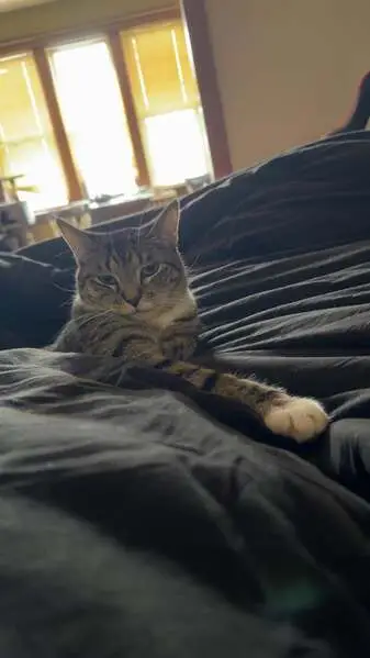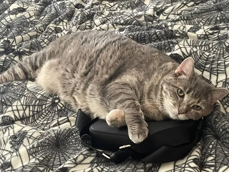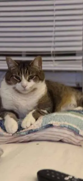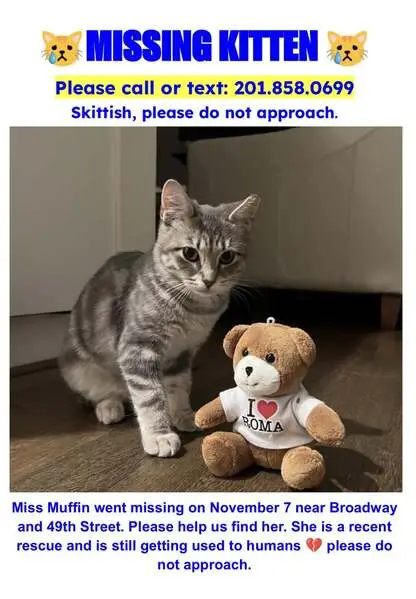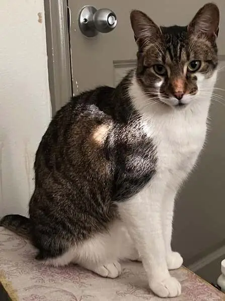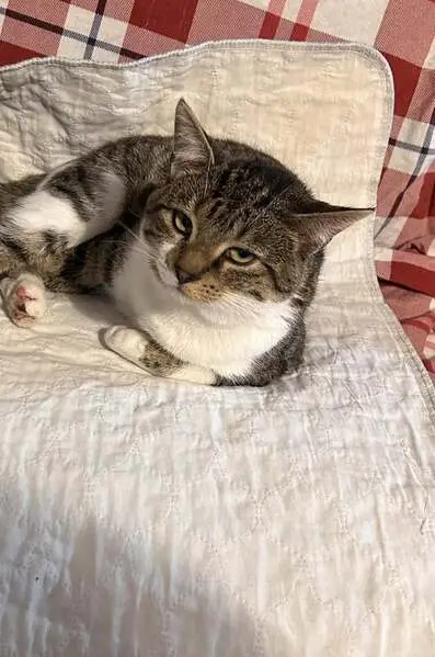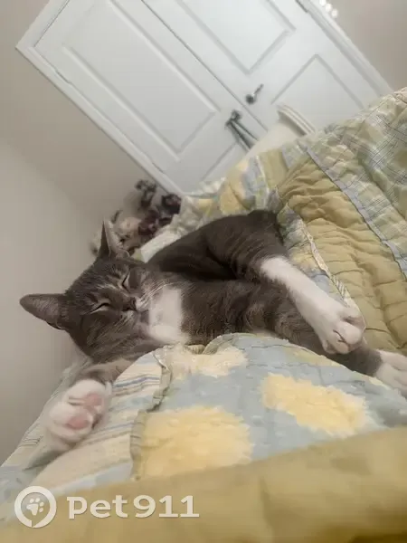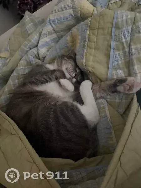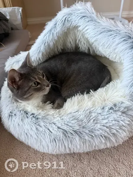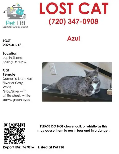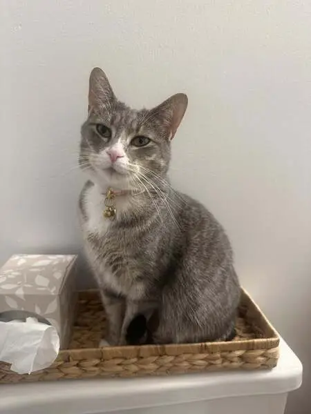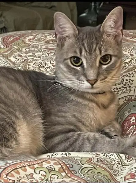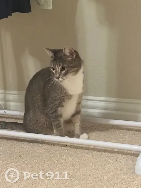 Female gray tabby cat (American Shorthair mix), about 1 year old, silver-gray coat with white chest and paws, striped tail, very friendly and people oriented. She’s fixed. Found wearing a sparkled blue flea collar with a small gold bell in Little Elm, Texas. The area we found her is a new community, assuming her owner might just moved in, the cat ran out of home and couldn’t find her way back