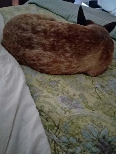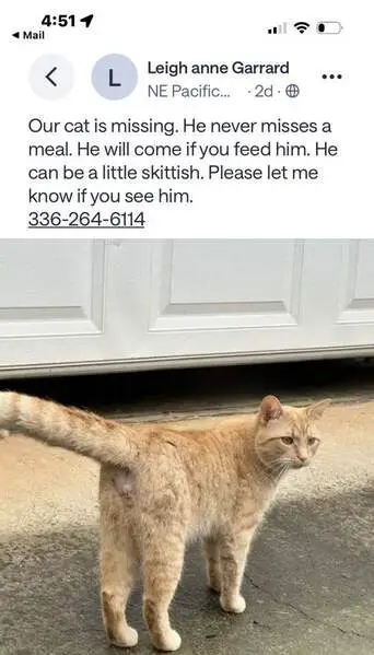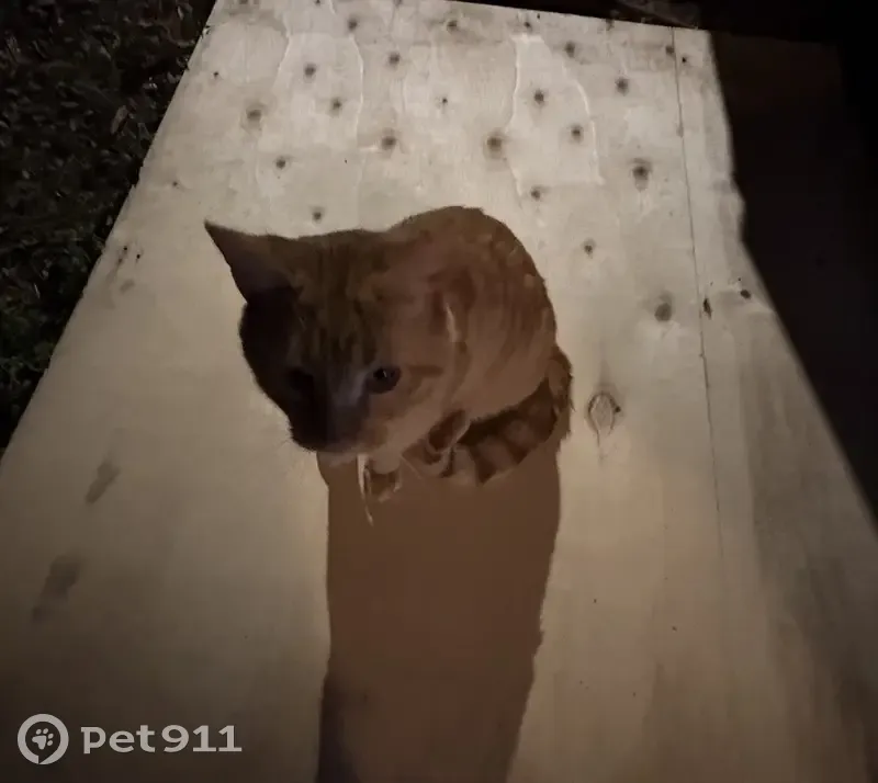 Orange striped cat, healthy weight, he’s a male, an absolute sweetheart, he was letting me pet him and was meowing at me as well as following me around. He has a high pitched meow, no collar.