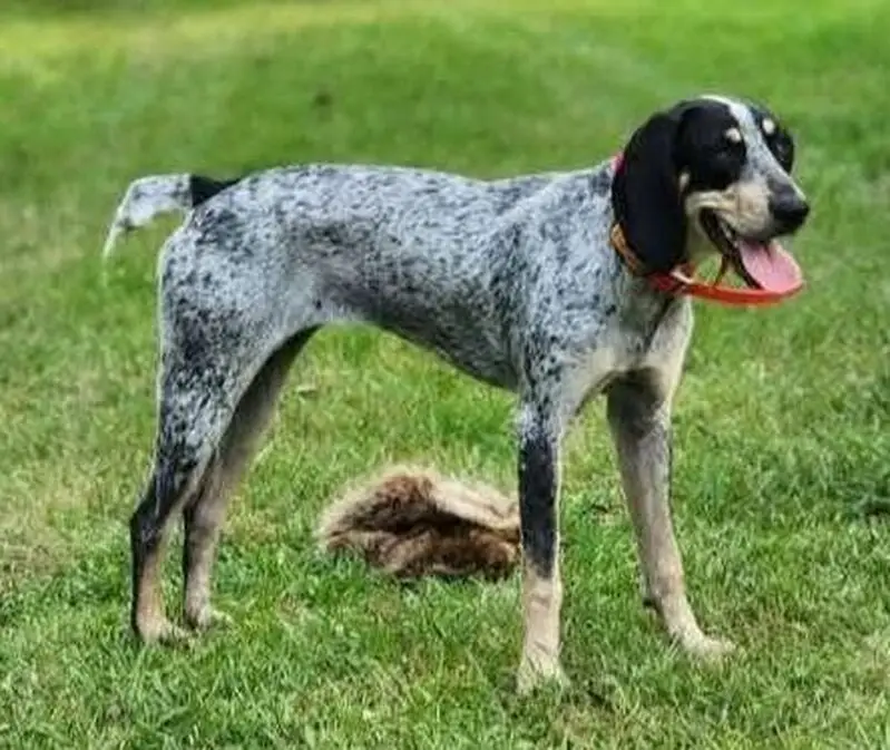 Brindle male pointer/hound with blue plastic collar. Skittish at first but quick to warm up and very sweet. Knows some basic commands and is good with my dog.