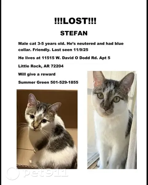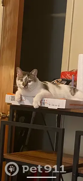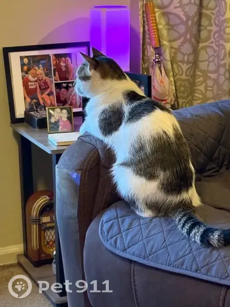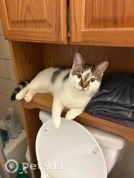 He’s got a lot of white on his belly, but black and gray stripes on his back and tail. He loves to be outside and will meow until you let him out. He is neutered and friendly. I let him outside and he never came back.