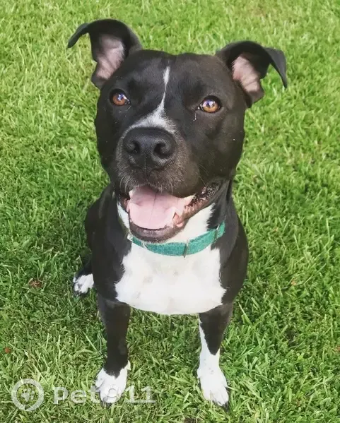 Black and white pitbull mix; little white stripe down his nose, white on his chest and his feet (like little booties). He is generally very sweet and friendly, but he also may be scared and anxious. VERY food motivated. Not wearing his collar and not microchipped.