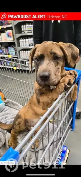 Brindle basset hound mix. She is very sweet but shy. Just call her name and baby talk to her and she’ll come to you. She has blue in HER right eye (your left) and LOVES kissing faces and nibbling on noses