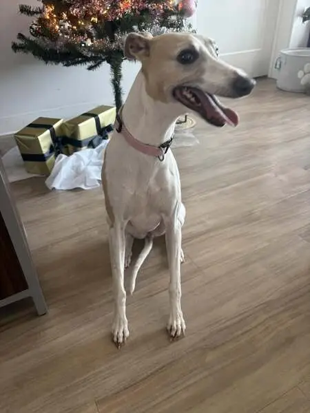 Very hyper, may be unfamiliar, he's 8 months , likes to bark, possibly had collar on( greyish brown collar, canvas texture, and has pull loop) has brown,white and black coat, long ears when up, pink hue to nose, brown eyes