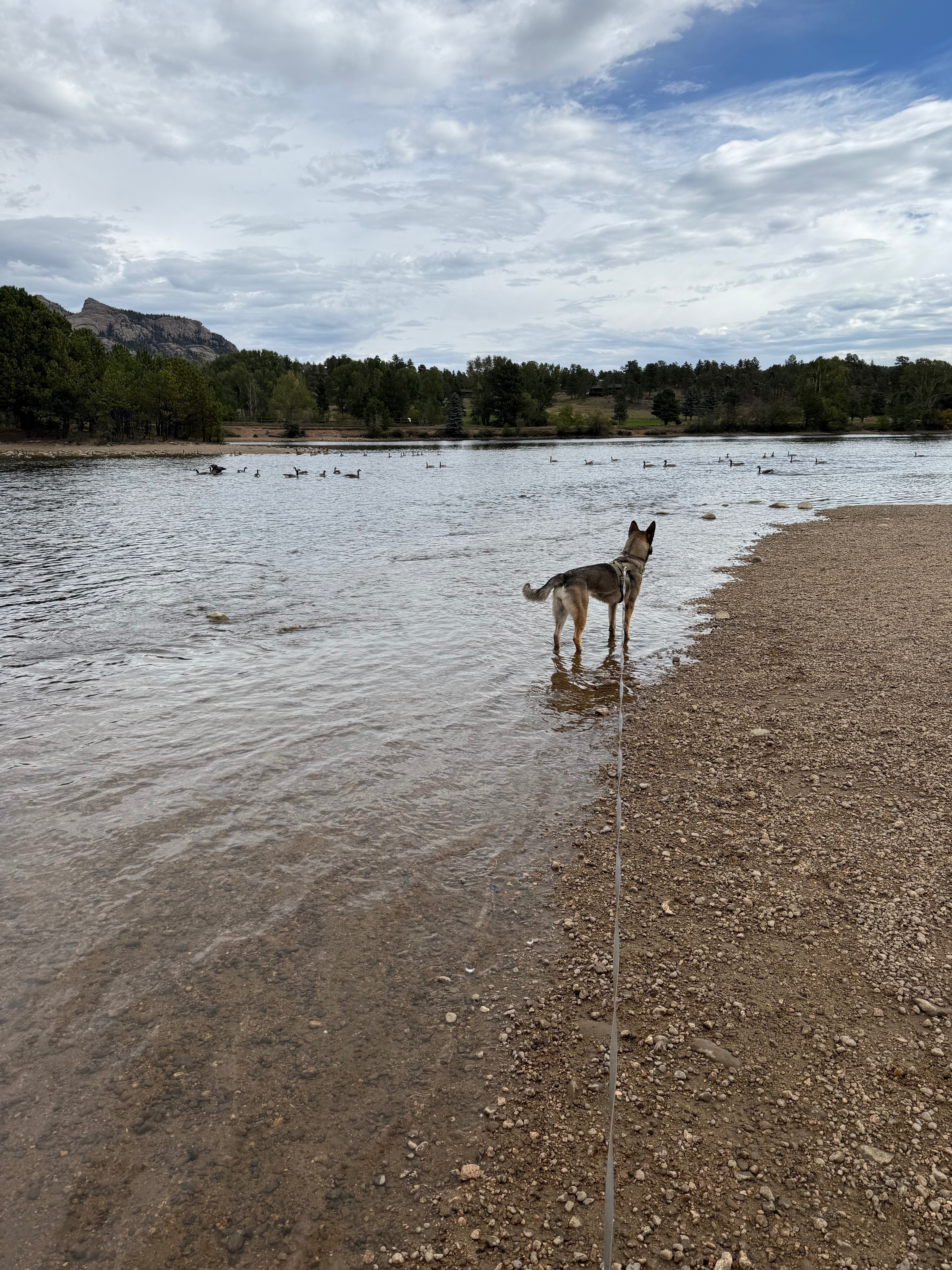 She’s a Shepard mix friendly but skiddish she has her leash on it’s a braided leash red white and blue a pink collar and green harness.