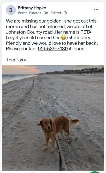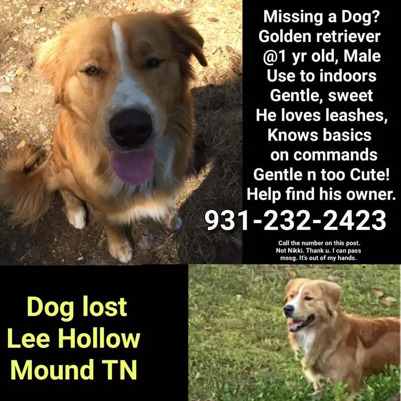 Gracie is very skittish. Do not approach her but call the number with Time and location of sighting. She is a very dark red golden retriever. Approximately 50lbs.