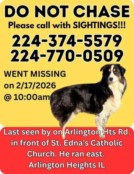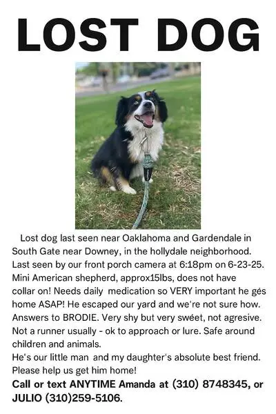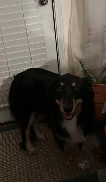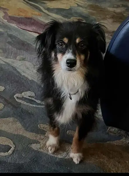 Looks to be a tri colored Aussie, clean, sweet, well taken care of and wearing a collar. Looks to have a family and had not been lost long.