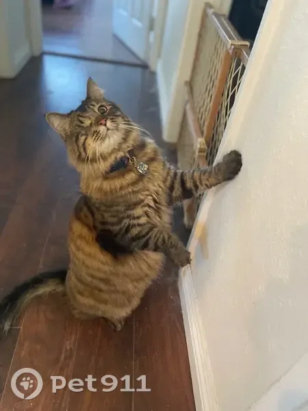 Pepito is a one-eyed, 5-year old Maine coon mix. His coat is black, gray, and tan, with some white—mainly around, especially around his chin. He has a long, bushy tail, a sturdy, squarish stance, and white tufts in his ears. His nose ends in a little, pink triangle. When he’s lying on his stomach he’s pear-shaped. He is friendly and talkative. He meows a lot! When he begs for attention or treats, he stands on his haunches, like a meerkat or a prairie dog. Pepito escaped from our house through a loose screen after midnight on March 23rd. He was probably attracted by a stray cat who has been coming through our yard.