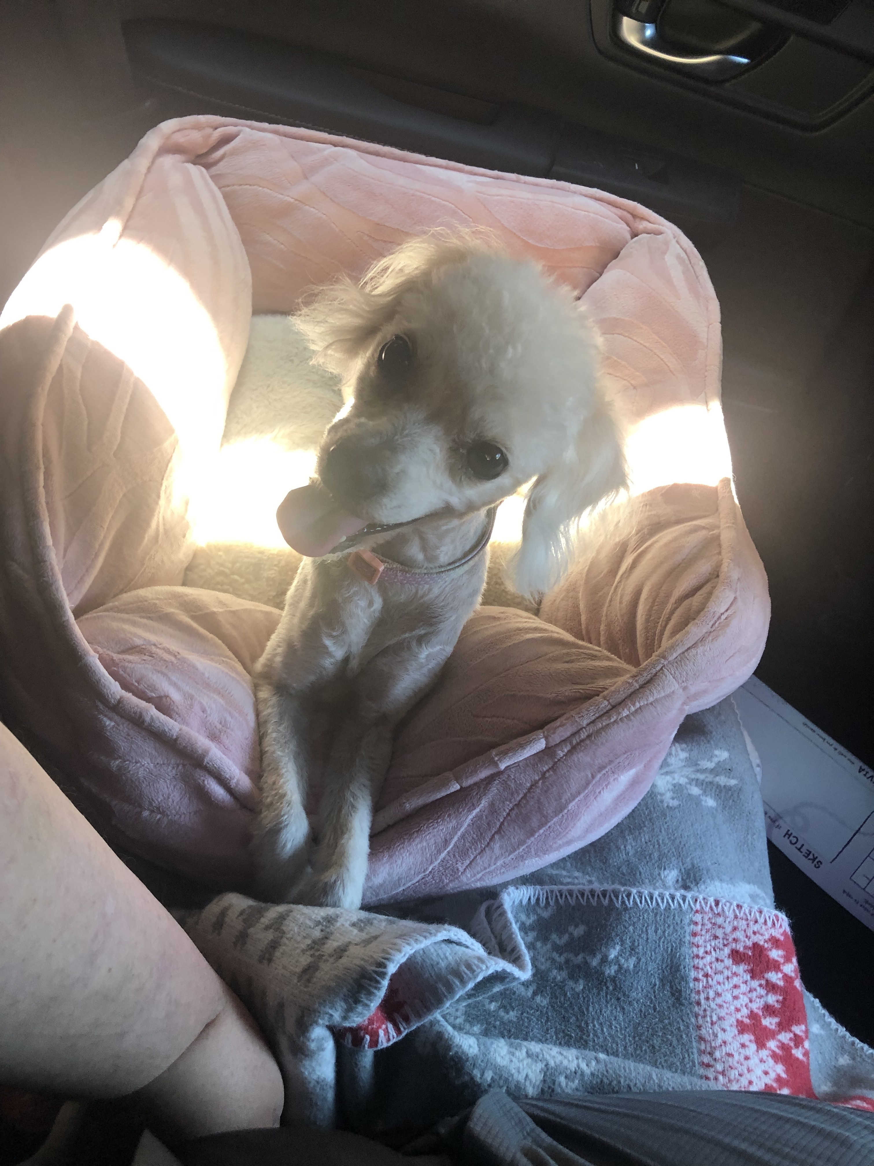 Small Mini Maltese poodle mix , white , is wearing a flower themed collar. She’s skinny but well fed . On thanksgiving day after we came home from family gathering we saw her sweater hanging from the fence and wire either cut open or ripped as she was trying to get out .
