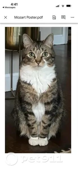 Mozart is a grey and brown tabby with a white...