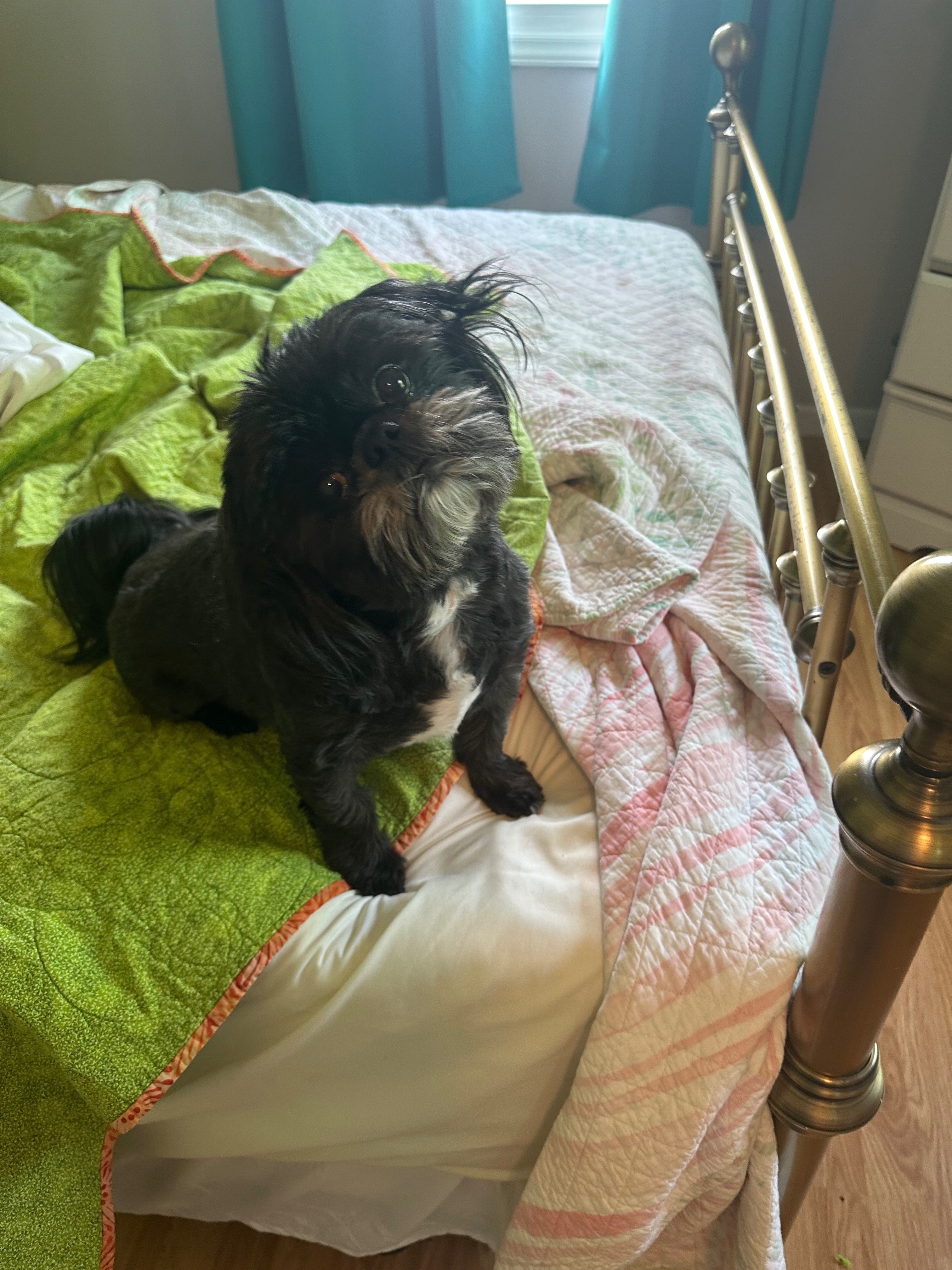 Older female shih tzu, black brown and white....