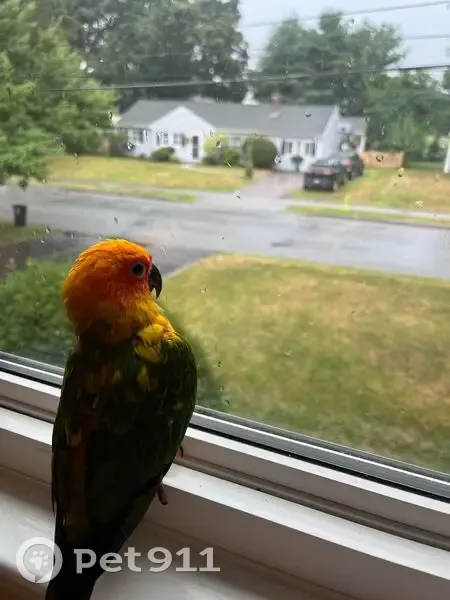 Maomao is a sun conure that is approximately 7 months old. We are unsure of his sex and have not gotten it tested yet. His back is green with some yellow feathers. As he gets older, his feathers will turn more yellow (this happens with all sun conures). He is very friendly and is not scared of humans! He will often land on strangers' shoulders (and has multiple times in the past), so we are worried that someone may have taken him home with them. We lost him in the evening of Saturday, 9/27/25. He was playing in the yard, and we were keeping a close eye on him, but suddenly our neighbor turned on the lawnmower, which made a loud noise. This noise scared Maomao, and he flew away. We have been looking everywhere for him and we miss him very much!
