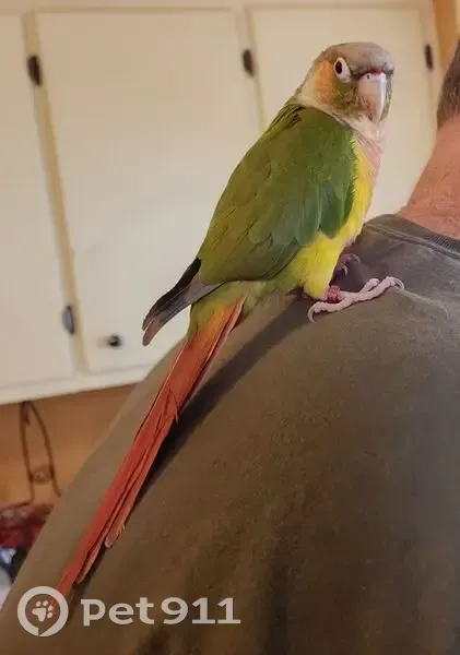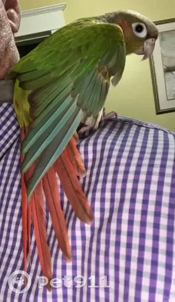 Multi colored Conure Parrot, Green wings with some blue, tan head, light colored beak, peach chest, yellow legs. Female. Friendly with people. Loves sunflower seeds. She is banded and has a red band on one leg numbered SP2256