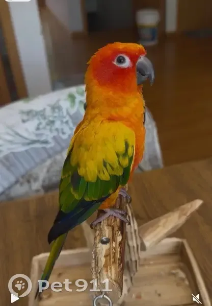 Sun Conure, small medium parrot, orange-yellow-red-green color, very pretty and tame. Out of the house by accident and got spooked and flew away. We have been looking for her everyday and offer $1000 reward for safe return