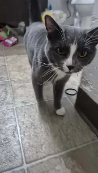 Stella is a light grey tuxedo cat with white on some of her face, belly, paws and the tip of her tail. She is very sweet and friendly, responds best to her name and food/cat treats.