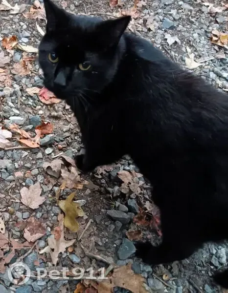 Leo is all black. He's 9 yrs old, neutered, & microchipped. He likes to lay in plant pots & in leaf piles. He knows his name. If you call him, he may come to you, especially if you have treats.