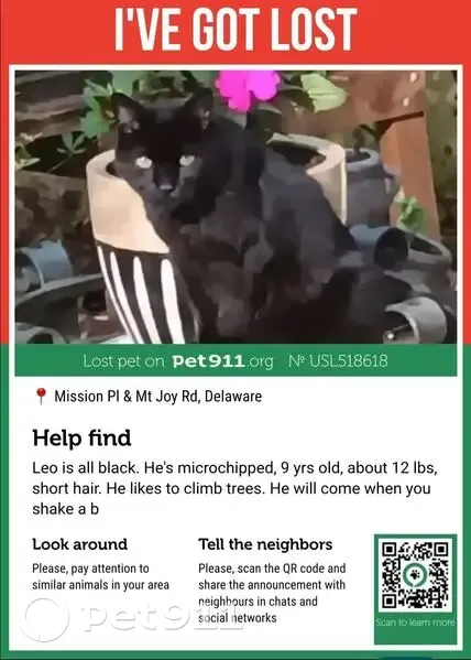 Merged with usl519582 listing. The reason is duplication of information. Description of the duplicate listing: Leo is all black. He's 9 yrs old, neutered, & microchipped. He likes to lay in plant pots & in leaf piles. He knows his name. If you call him, he may come to you, especially if you have treats.