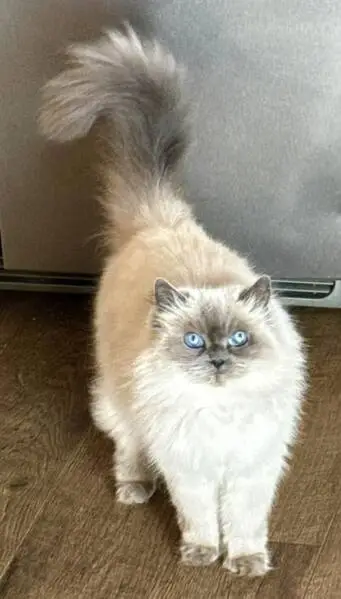 White with yellow ears and tail, he has long fur. His eyes are blue. He's very fearful and barely listens. He scares easily. He's a house cat who always stays indoors.