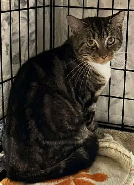 Gray and white cat, with darker markings on his back He got out the evening of Sept 14. He’s mostly scared of other people, other animals, loud noises, but is food motivated. Loves wet cat food, treats, tuna
