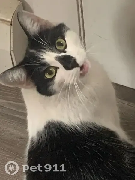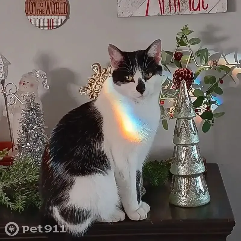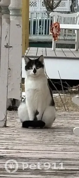 He is black and white with a white chest and solid black triangle on his nose. He has a white belly with a black diamond in the center. He is very friendly and has been known to get in neighbor's vehicles and go into their homes on occasion. Went missing in the very early morning hours of 717/25.