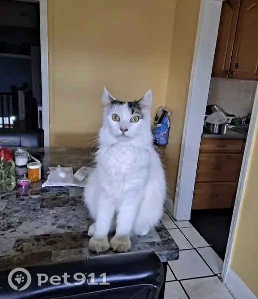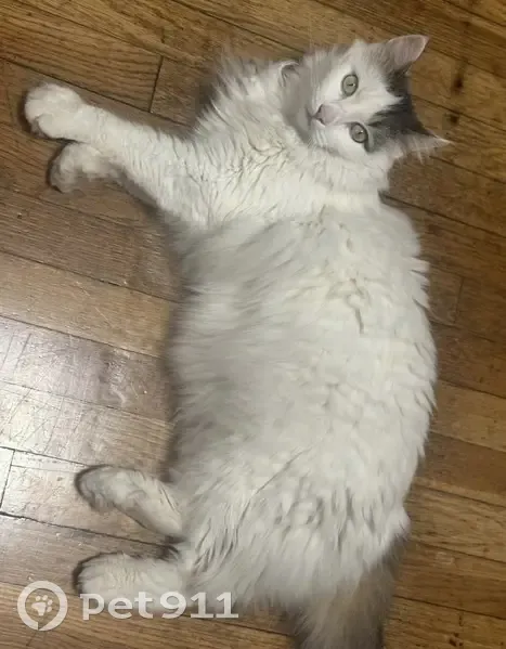 He is timid. Greenish eyes, He is white but has black gray fur spot at the top of his head and tail. He is a bit petite and skinny.. He is now curious of the outdoors. Look at her paws, he had swimming syndrome when he was a new born.