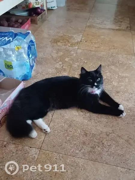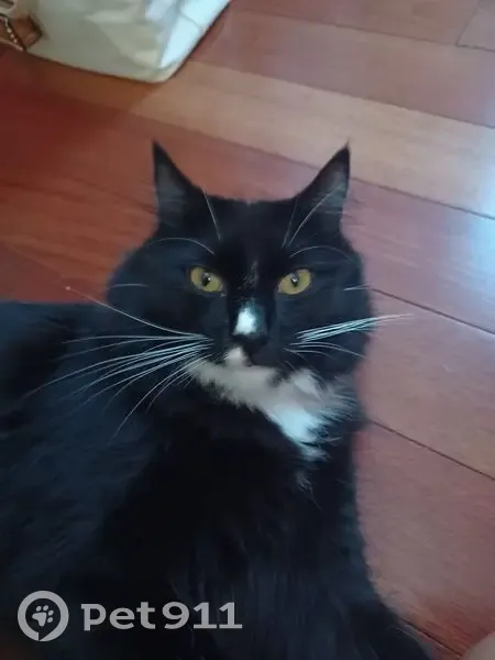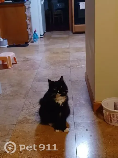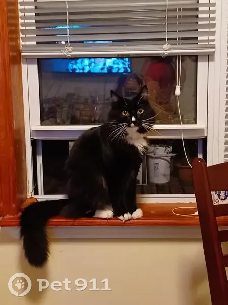 Medium/Long Hair Tuxedo Cat. 4 white paws and a white triangle around neck. Wearing a blue collar with pink pompom. Went outside our house Sunday night and did not come back by Monday morning.