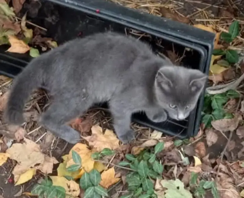 Bright yellow eyes, very soft, and thin dark grey hair. He has slim build, and moves low and quick. Basement door was left open. He has never been outside before. He was a rescue and is extremely skittish.