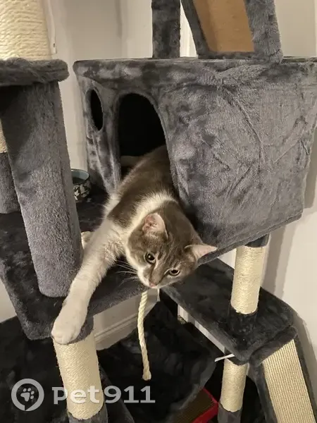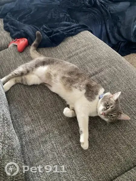 The cat is grey and white with a short haired coat. She is very sweet and will usually respond to being called kitty. He also is chipped and have a pink collar with gold a pineapples.