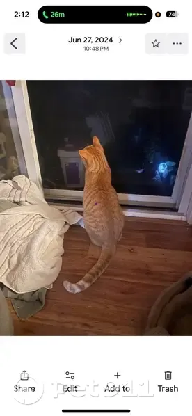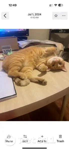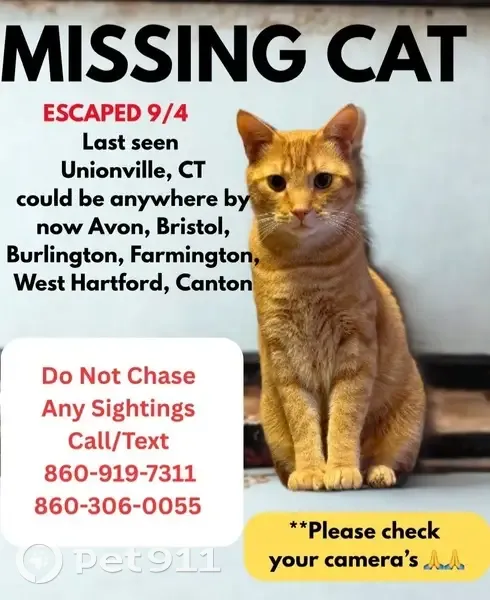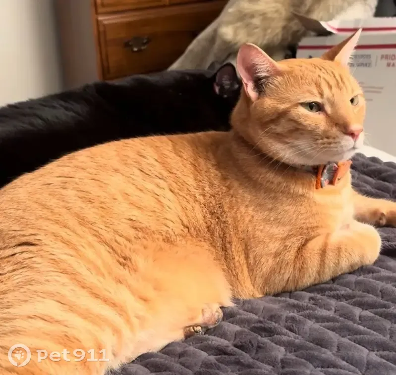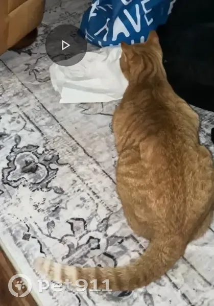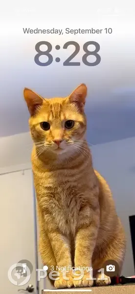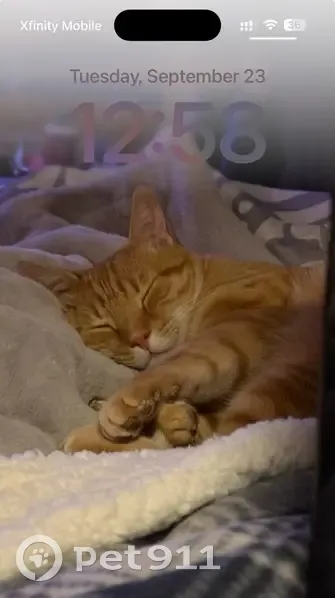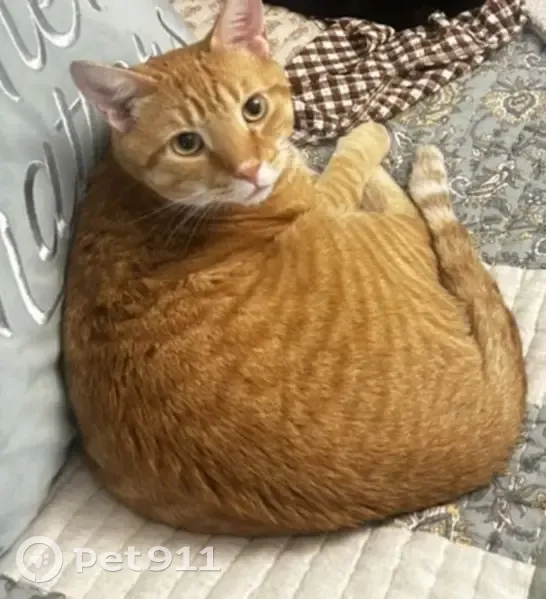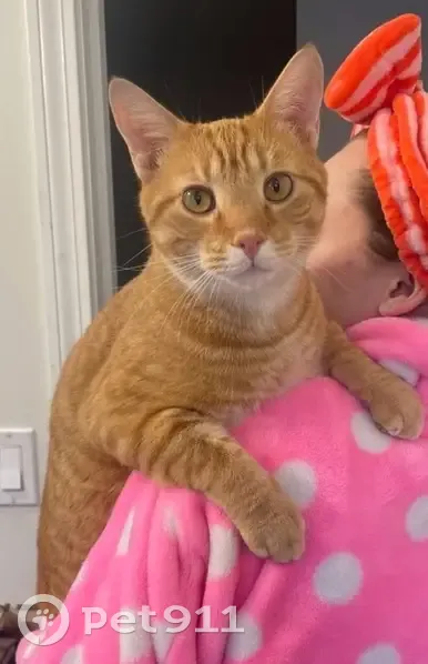 I’m an orange tabby cat, I have 3 white rings and a white tip tail…. My paws are orangish (same color as my body/not white) and I have a white chin. My body is mostly orange and tan striped. I’m super friendly usually but if I get afraid or defensive I can hiss like a Rock Star even though I’m harmless…. My hiss is all for show BUT maybe call my Mom if you see me she might know how to handle me vs a stranger if I’m showing signs that I’m afraid…. I love my play mice, bells and I love to play fetch…. You throw my mice and I’ll bring them back to you….