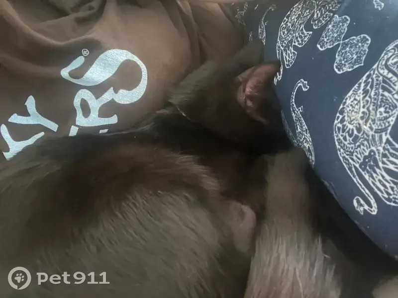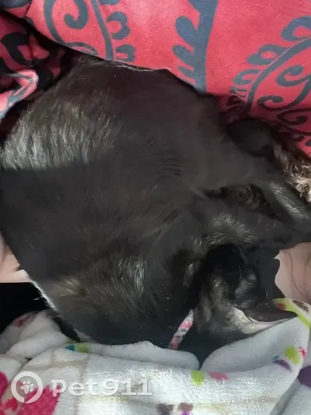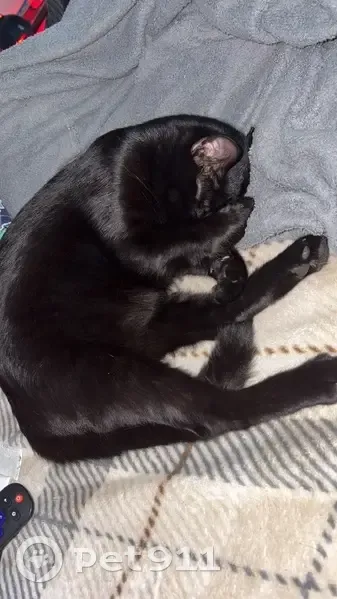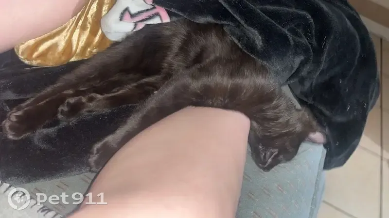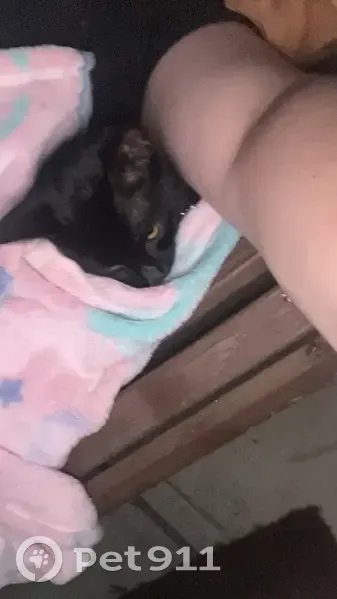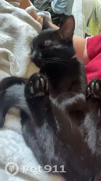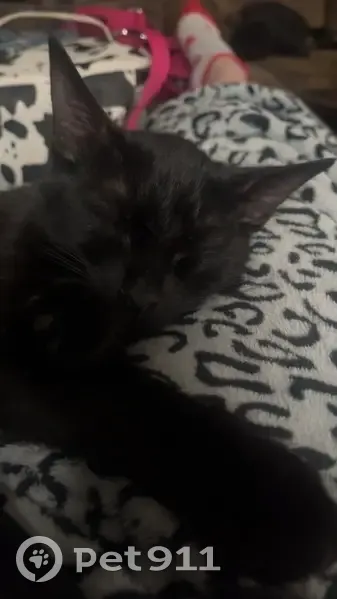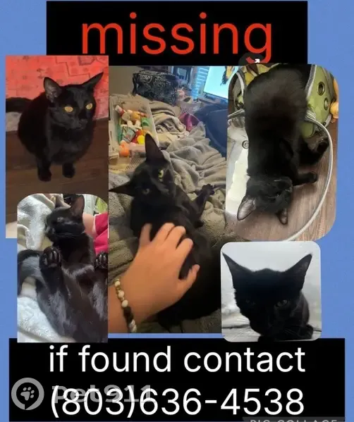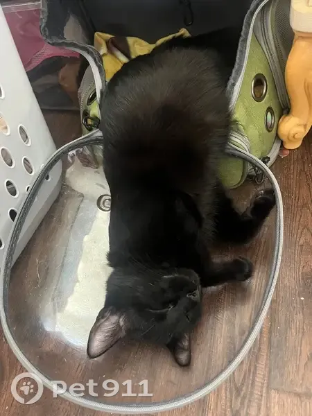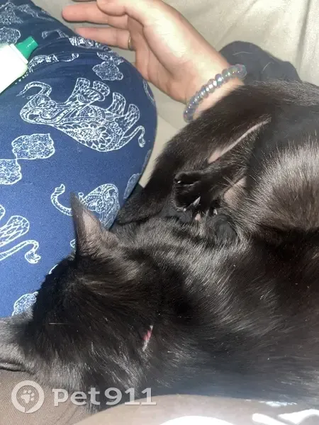 Black Bombay mix, slim pointy face, big ears with slight bald in front of ears sassy walk neutered tail curls at top green eyes, soft meow, very sweet personality and soft coat. He’s an indoor outdoor cat. He went on one of his adventures and never came back. 10 months old. He goes by his name Binx as well as binky baby and beast boy