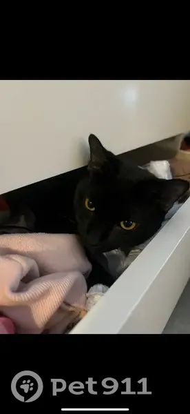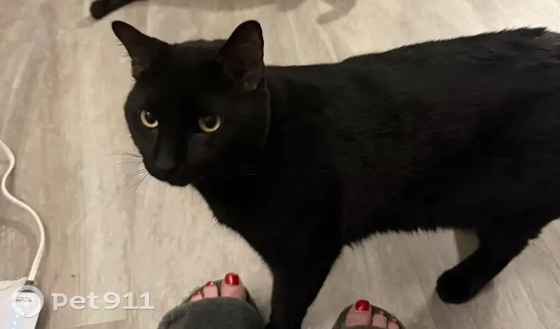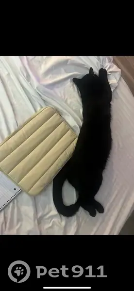All black with no white spots, yellow green eyes, very long and strong build, he is sooo friendly and the kindest cat I’ve ever met. He’s has shiny black short hair