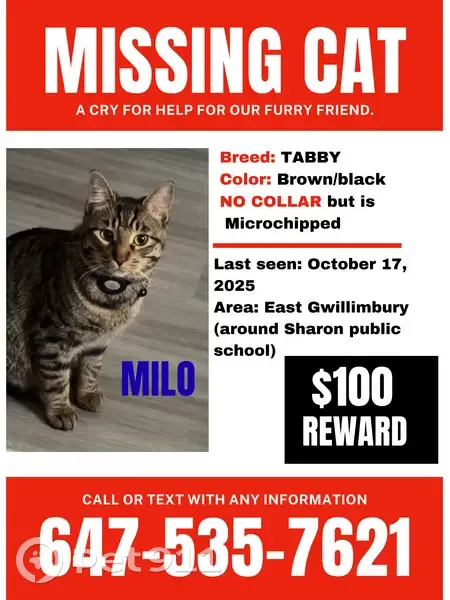 Name: Milo (male) breed: Tabby/mix color: brown/black eyes: brown/yellow he’s on the bigger side has NO COLLAR area: east gwillimbury (around sharon public school) last seen: October 17 1AM