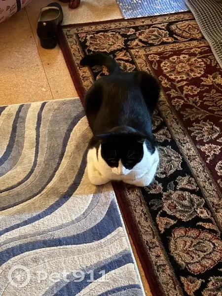 Tuxedo cat that has partially white face with white chest, underbelly and legs. He has a lot of whiskers even above his eyes. He is skittish but food motivated.