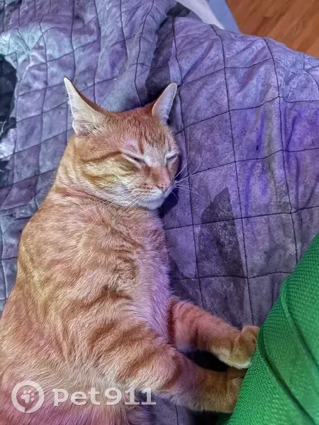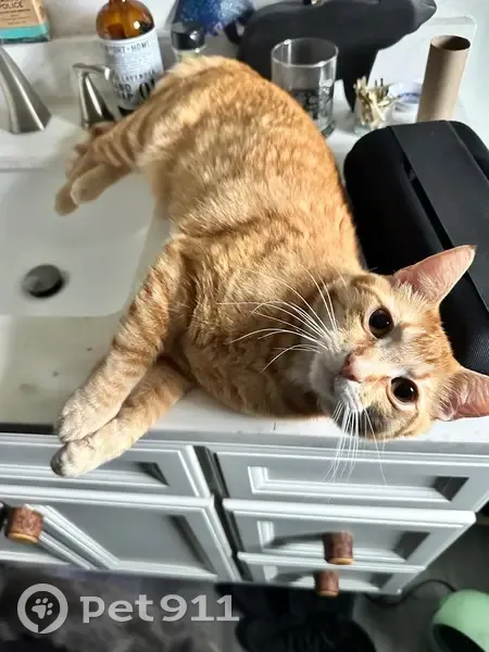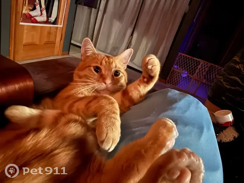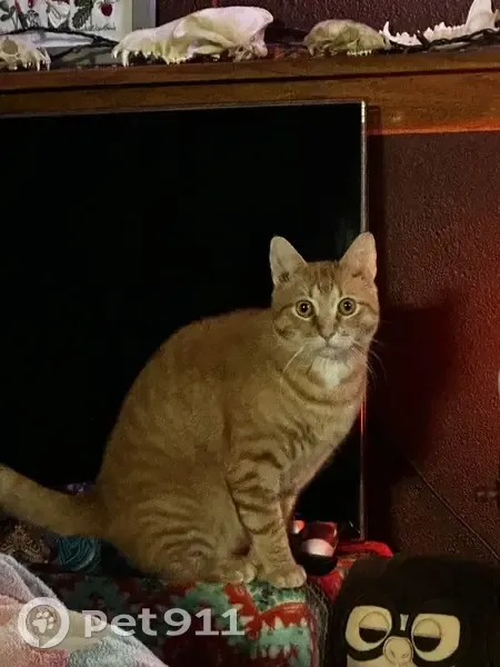 3yr old Orange tabby, male neutered and chipped. Fully striped tail and body, White chin and orange eyes. He left out the back door and then it rained that night. Usually he scampers to the Neighbor’s wood pile, but he’s not there. Very affectionate and responds to his name.