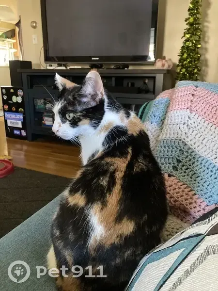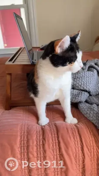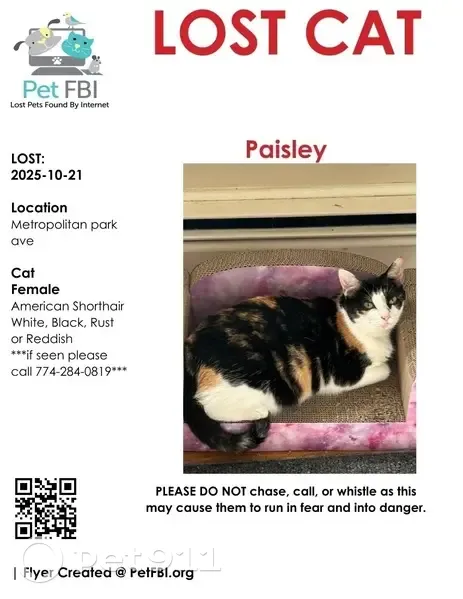 Paisley is Polydacyl (Double pawed), calico, mostly white with black and orange markings. Small-under 10lbs. Short haired. She went outside early morning 10/21 and did not come home.
