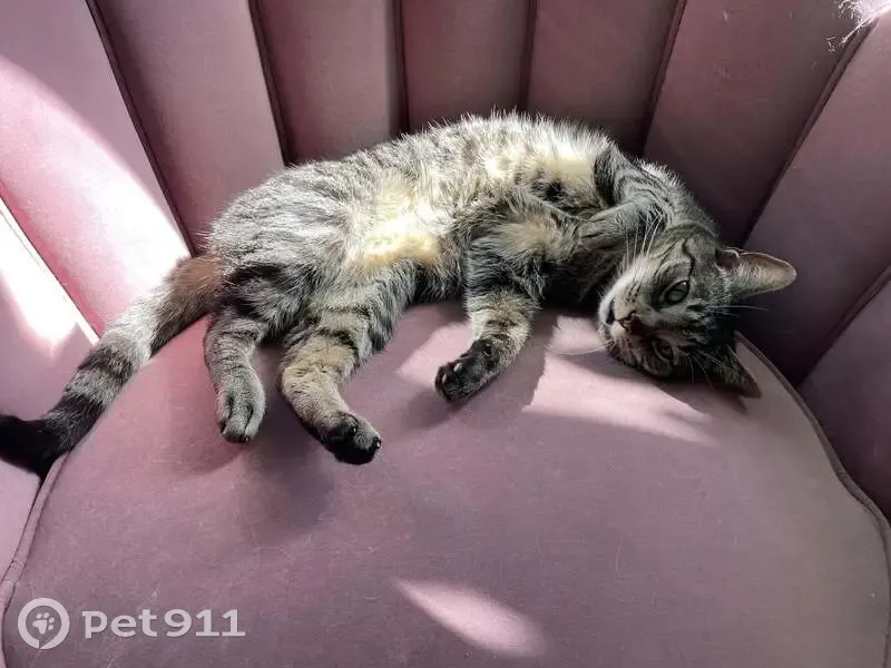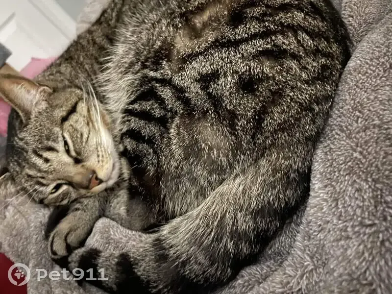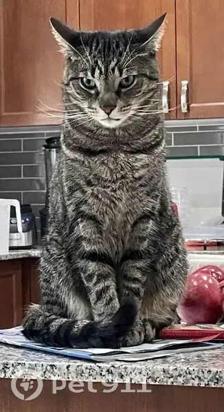 American Shorthair, male, neutered, black and gray striped, medium build ~5kg, no collar, slight kink at end of tail. Food motivated but only dry foods. Has loose skin on his belly from neutering.