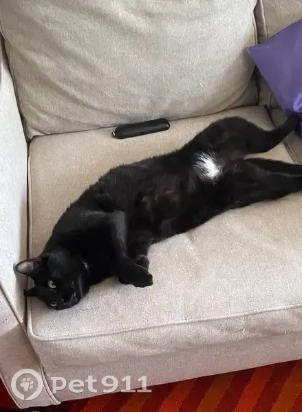 He goes by the name “boss”. Very gentle, very friendly. He is all black with a white spot (locket) on his chest and a white blotch on his crotch (panties). Mediumish size, male, fixed, chipped.