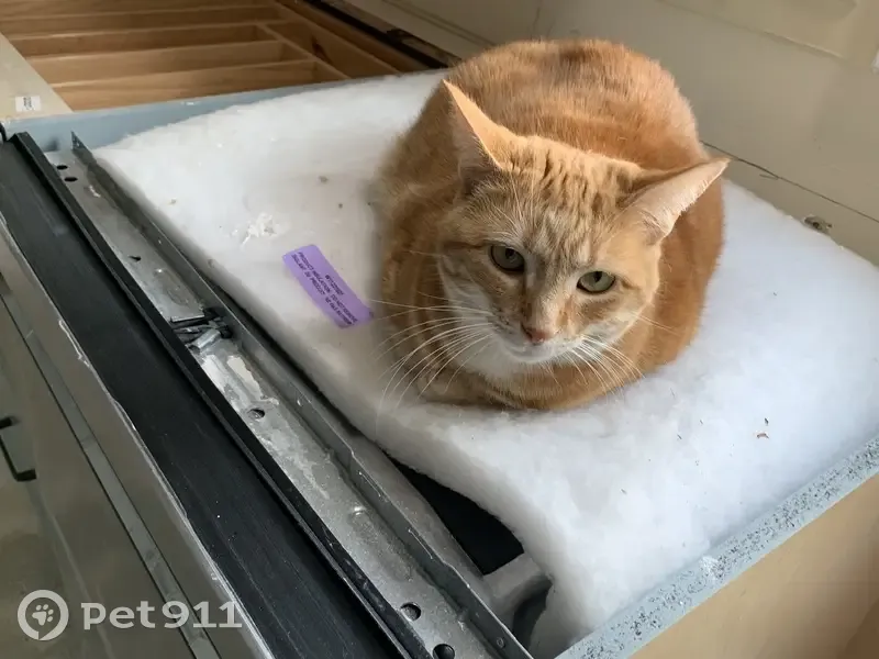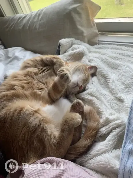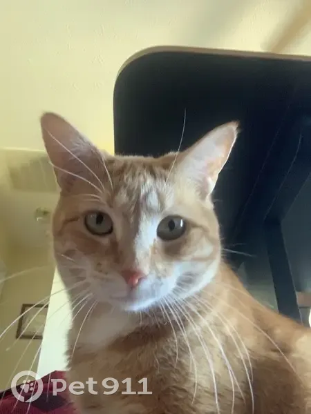 Orange tabby, quite short and chubby, very food motivated and friendly to humans, does not like other cats or animals, has a medium length coat. She went missing and nobody saw her leave the house, but we could not find her inside at all. She gets out sometimes but never goes far and usually just stays on the front porch.