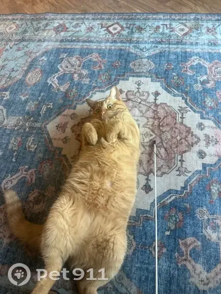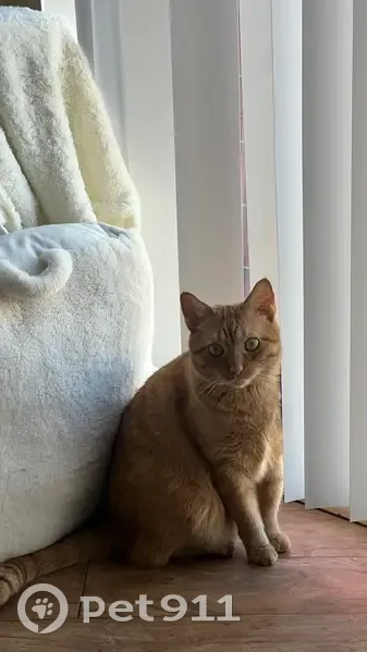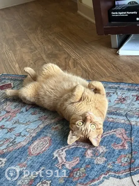 He is a short haired orange cat, copper colored spiral on his tail. Round face with black birth marks on his gums. He was about 12 pounds from about a month ago.