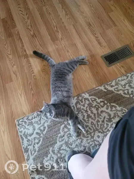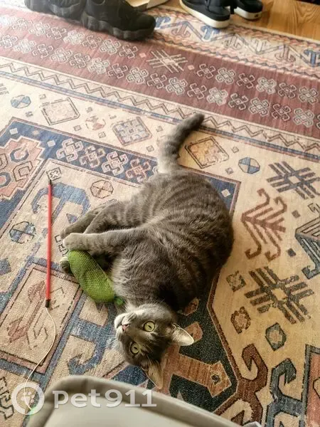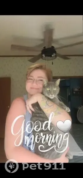 Gray with slight stripes, bright green eyes, SHOULD have gray Seresto flea collar on. Slim build, about 10 lbs. Friendly to humans, doesnt like other animals.