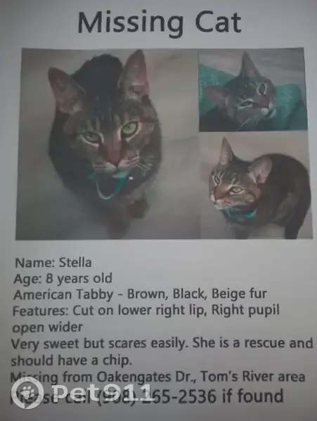 Tabby, brown , black and beige fur. Cut on the lower right lip and right pupil is a little wider. 8 years old. Rescue . Not sure where she got out from .