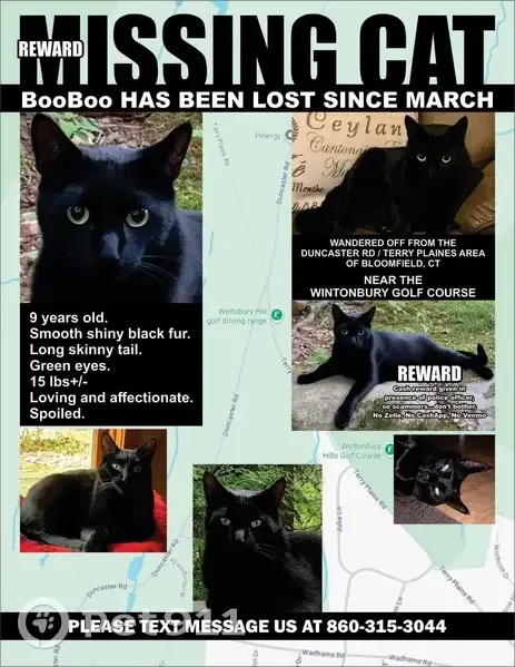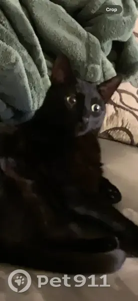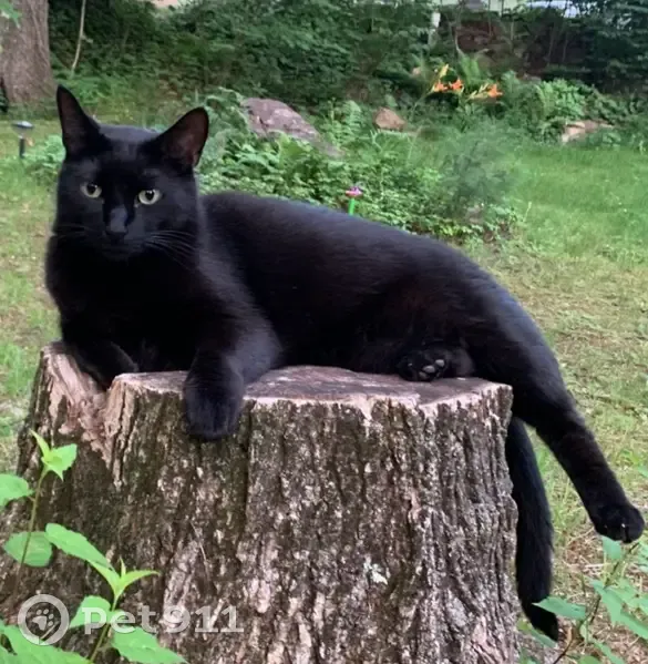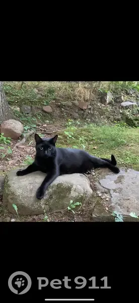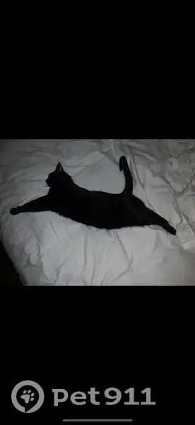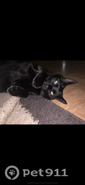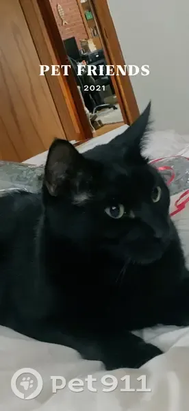 Friendly, 9 Year old big muscle boy with lower hanging belly, all black shiny fur, long tail, fangs and pointy ears. He disappeared after stray cats showed up at my house.