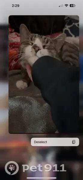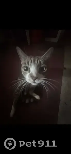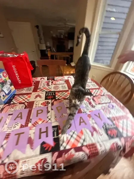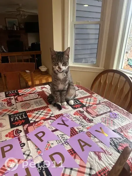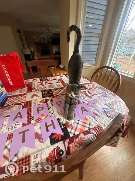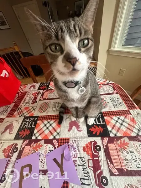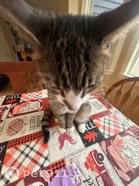 He's a small- to medium-sized, short-haired tabby with a black, grey, brown, and white coat. He has white feet. He was wearing a collar, but it was recently found in the woods, so it's possible it fell off or got stuck. He’s friendly but sometimes shy if he doesn’t know you. If he’s comfortable with you he likes to rub his head against u and bump his head into you over and over again. On his face area around the nose area is white but also has some brown and black spots. He has a white fluffy-ish belly. The pictures i’ve shown can help describe and give a clear example of his appearance.