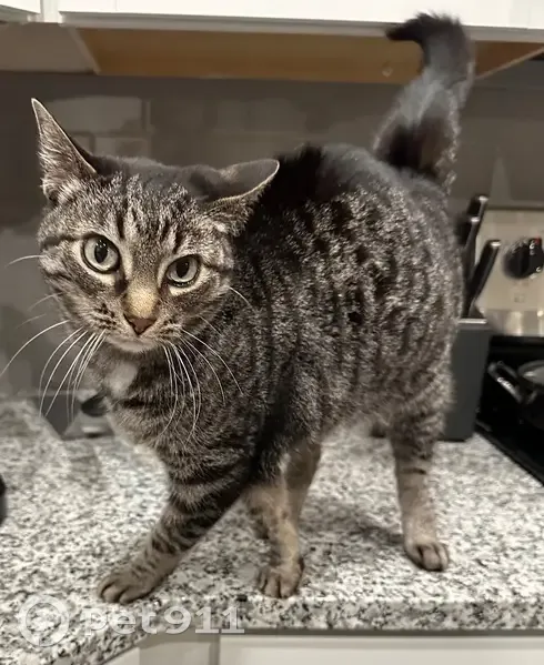She is a grey tabby cat with white patches on her chest, chin, and belly and a bit on tan on her nose. She has short fur and not wearing a collar. Around 9:30 AM one of our doors got open and she slipped outside. Using our doorbell camera, We saw her sit in the driveway a bit before walking off to the side of the house. She has done this a few times before but always returned before her next meal time. She is a very calm cat but usually hides around strangers, however since she has not returned home she maybe stuck somewhere.