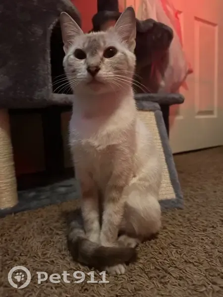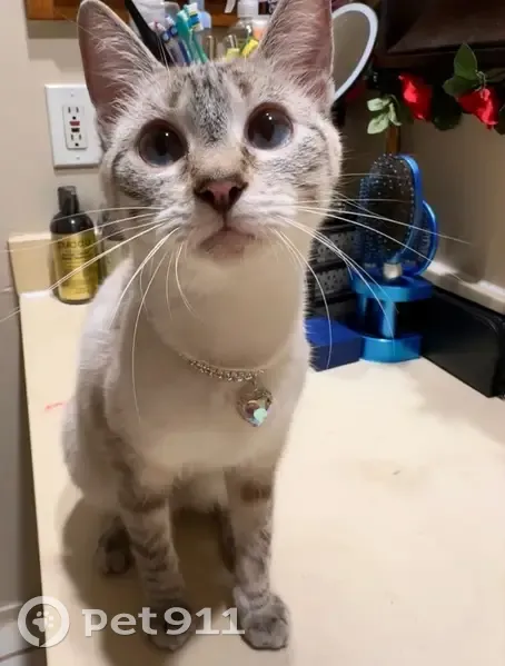 She is pretty small, tiny small dot on her nose, white with bluest eyes, brownish black stripes on tails and legs and head, Black paw, tanish tone behind her ears