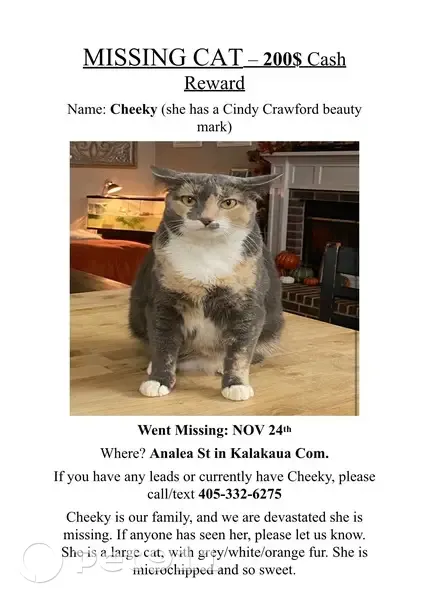 Cheeky is a very sweet girl, but shy. She’s about 13 pounds and a very long cat. She is microchips and fixed. Her defining feature would be her Cindy Crawford beauty mark on her upper lip.