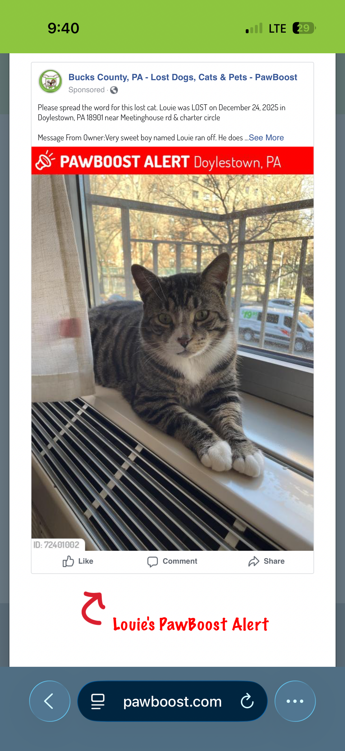 Brown striped tabby male cat Louie (3.5yo 14lb) escaped 12/24 2:15pm into the backyard of 77 Meetinghouse Rd in Doylestown PA. He’s micro chipped and neutered - fully indoor so probably hiding nearby. Classic tabby brown/black with white stripes and white feet and chest. Very social usually but he is probably scared as he’s totally unfamiliar with the area (we were just visiting for Christmas so he’s new to the home here) and it’s been hard to lure him back (leaving wet food, laundry outside etc). Please let us know if any cats come through with that description and if you can blast this info to all of the local vets and shelters in the Doylestown/Bucks County area that would be so appreciated. 6107313344