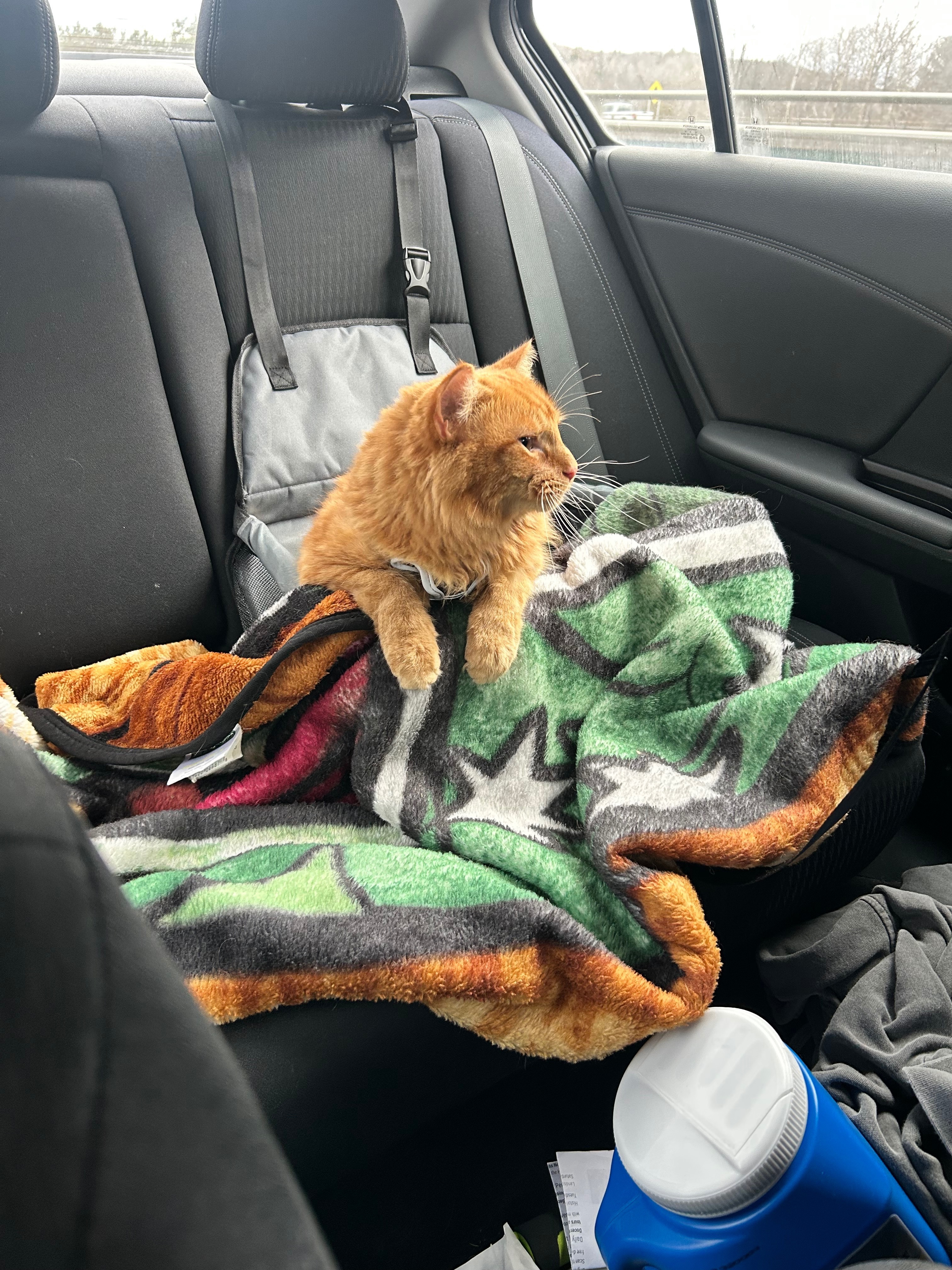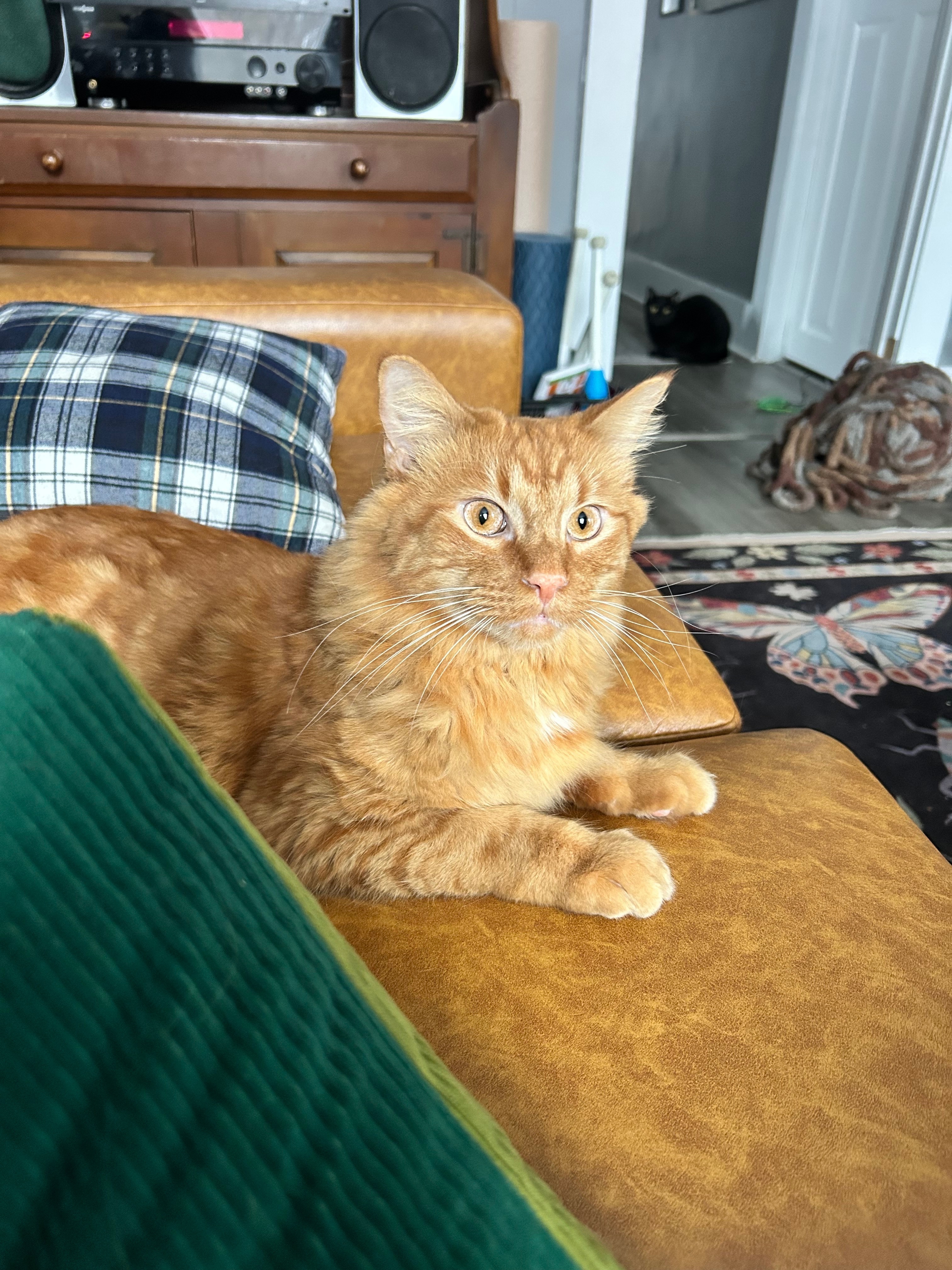 Orange domestic longhair, Long bushy tail, Small patch of white under his chin. We slipped on the ice bringing him in from the car and he slipped off leash at around 8:30pm. We looked for him pretty much all night and have set out a small shelter with some of his favorite items inside. We were able to follow his tracks around the neighborhood and a neighbor close by spotted him on a doorbell camera around 4:00am 12/31.