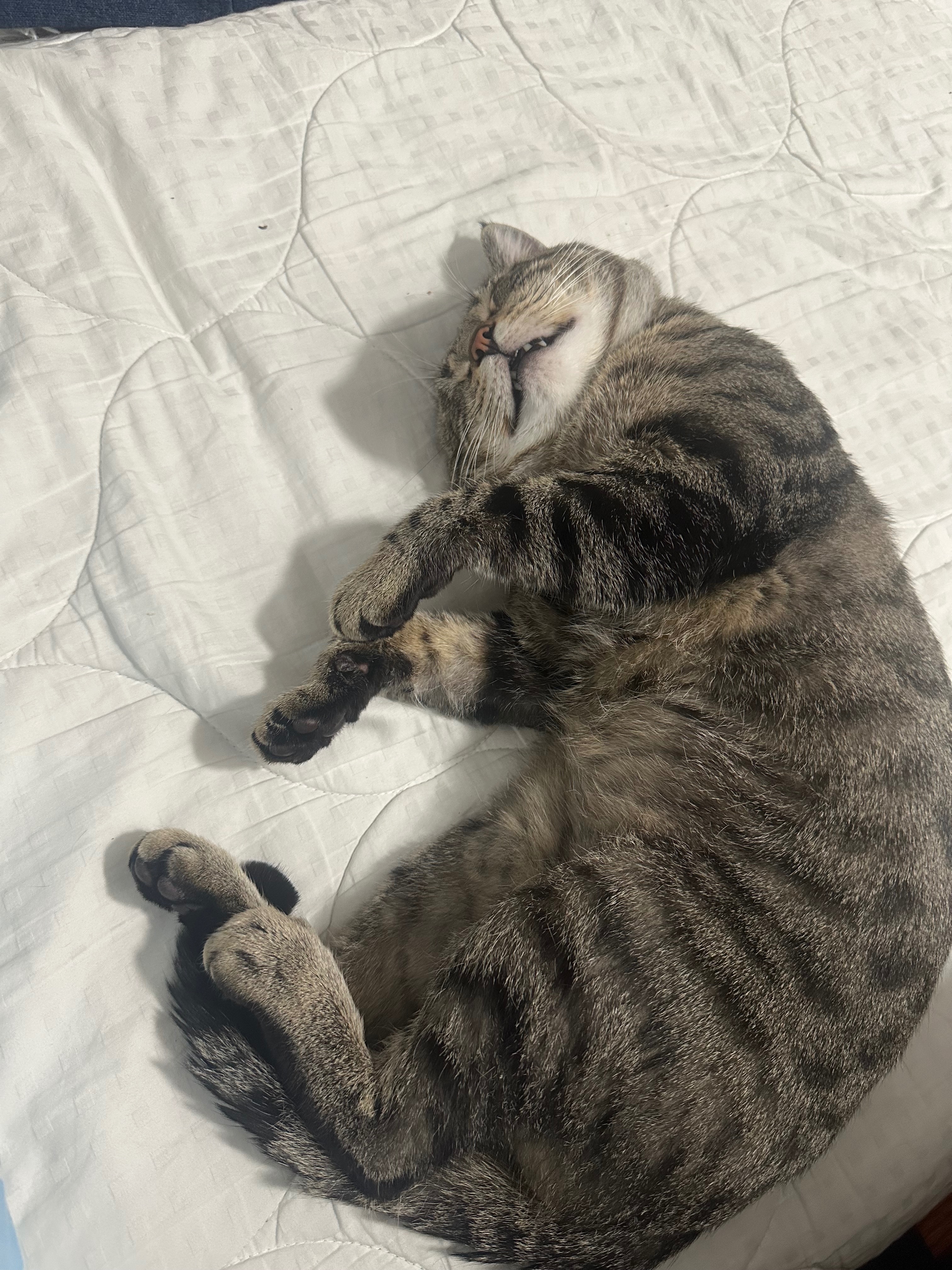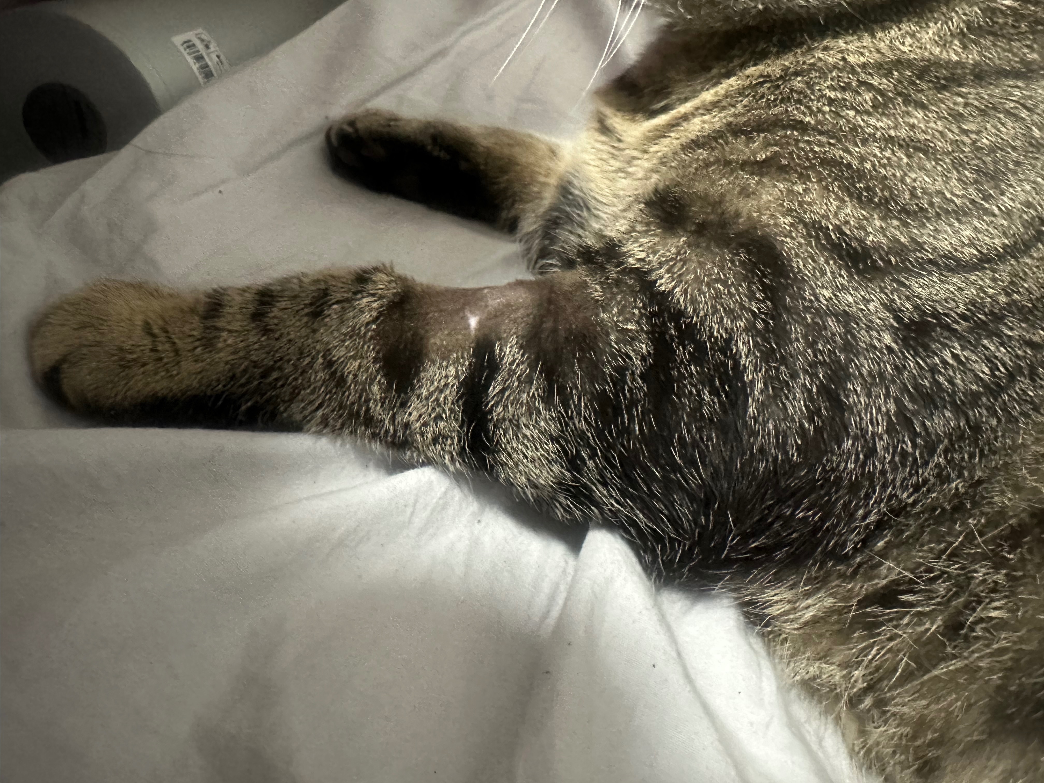 Grey brown tabby, has a bit of extra fur sticking out on top of his ear, and a small bald spot on the back of one of his ear, he also has his left arm partially shaved because of a doctor's visit last time. And he has a blunt tail because I had to cut some of his hair on it because he jumped on the stove the other day .