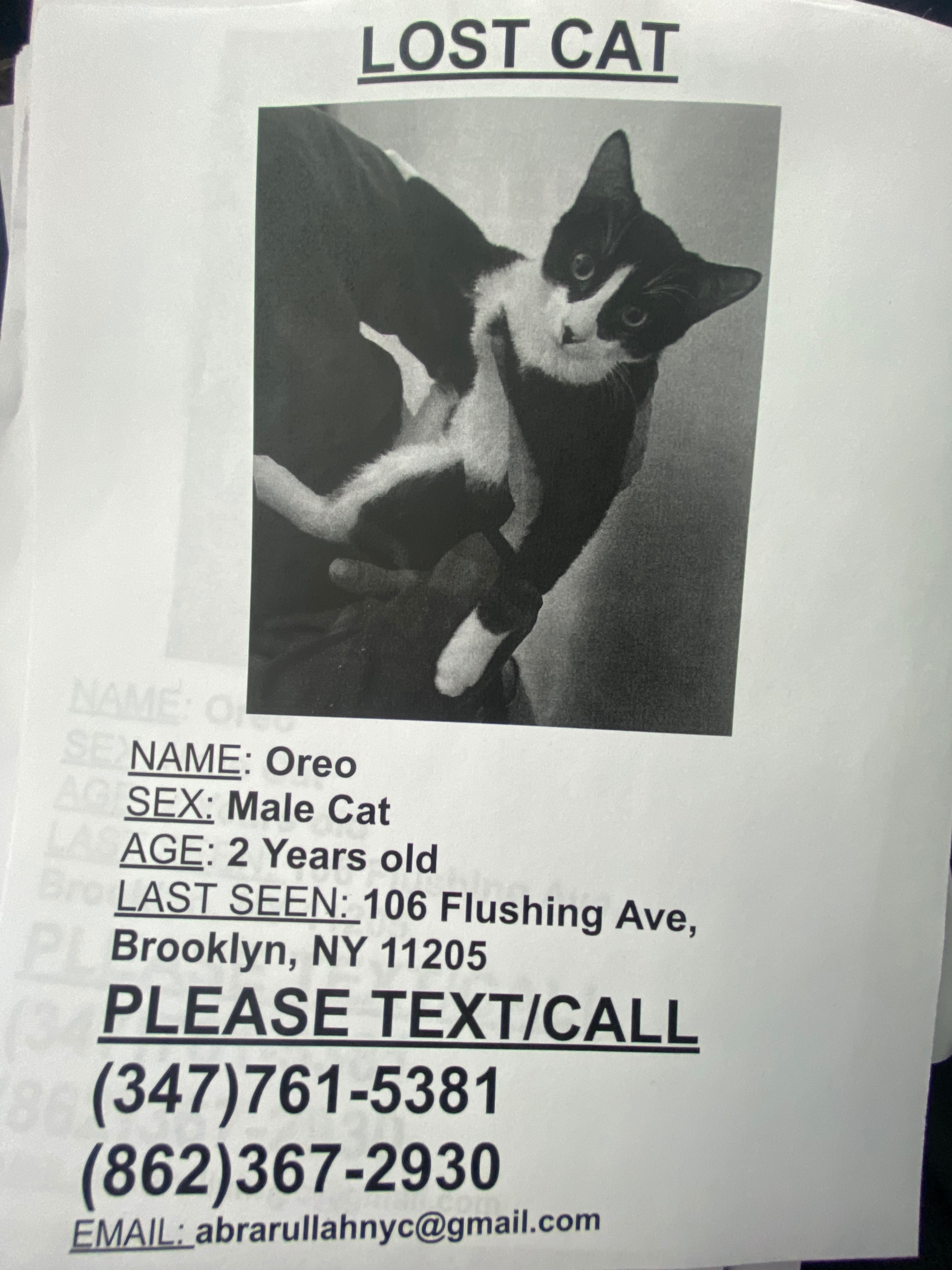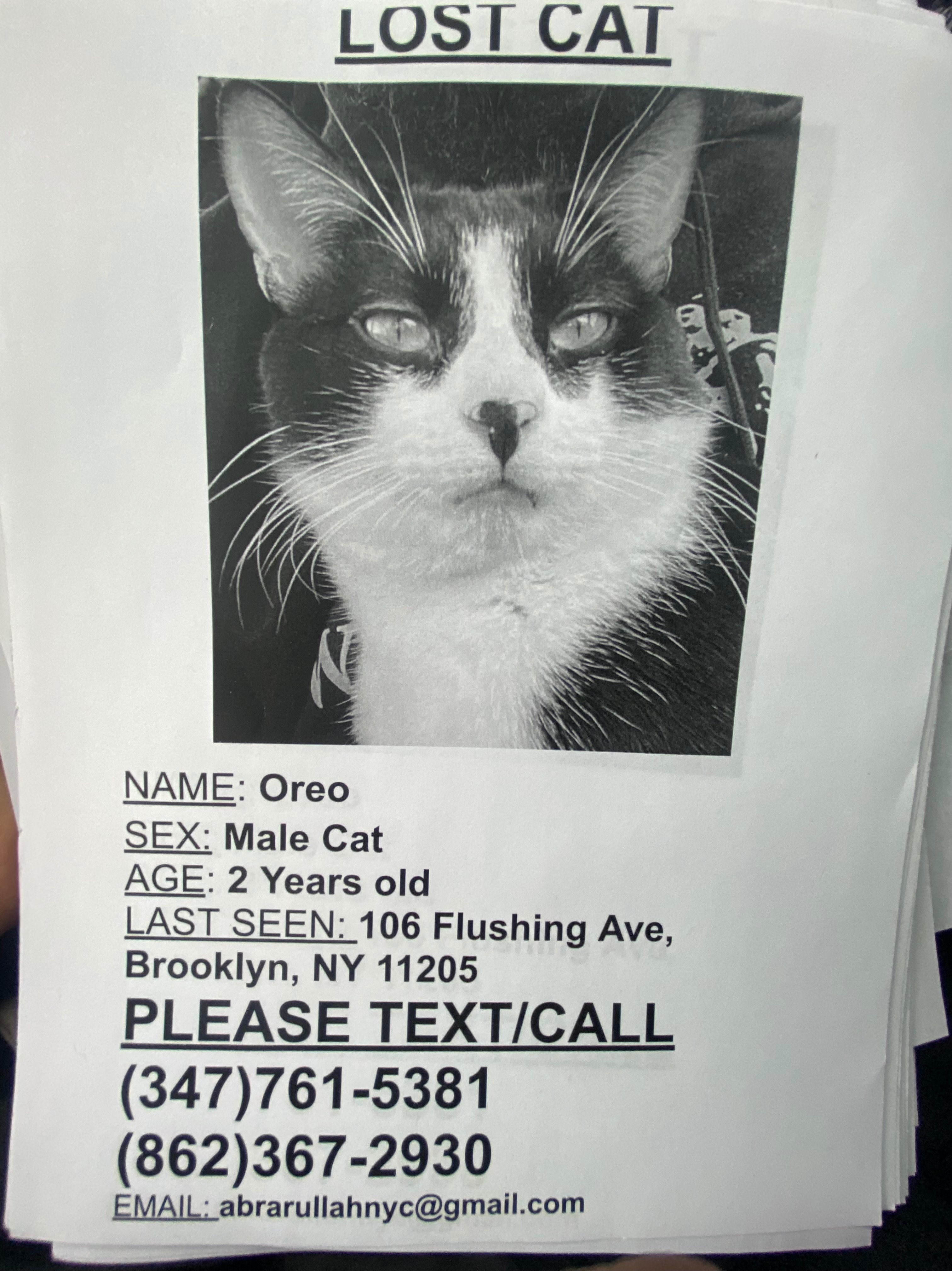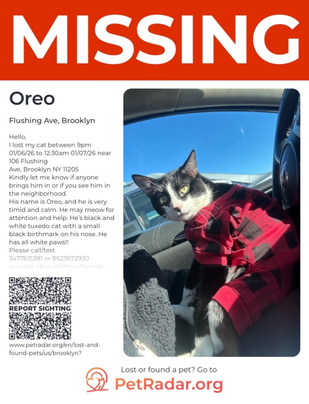 I lost my cat between 9pm 01/06/26 to 12:30am 01/07/26 near 106 Flushing Ave, Brooklyn NY 11205. His name is Oreo, and he is very timid and calm. He may meow for attention and help. He’s black and white tuxedo cat with a small black birthmark on his nose. He has all white paws!! He was possibly spotted two nights ago by someone, the night he went missing 01/06, on SOUTH PORTLAND AVE between DEKALB AVE and LAFAYETTE AVE. Then someone else spotted him near FORT GREENE PARK On DEKALB AVE between WASHINGTON PARK and CARLTON AVE walking from the NORTH to the SOUTH of DEKALB AVE @11PM on 01/07. If you live near FORT GREENE PARK please keep an eye out for a black and white tuxedo cat with all white paws and a small black birthmark on his nose. I will in the area and in the park searching for him. Any help is deeply and greatly appreciated. Thank you all for the help and support!!!